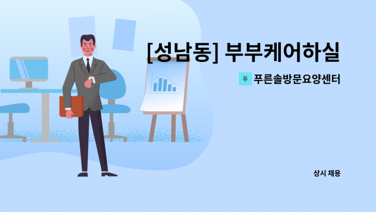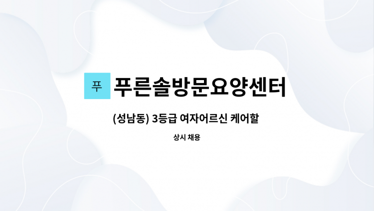 [정자동, 한솔마을 7단지] 4등급 할아버지 케어하실 요양보호사 구인 - 주 6일 / 오전 08:00~11:00 - 시급 : 12,500원 (각종수당 포함) - 일상생활지원(요양보호선생님 M) * 실제 서비스 제공기간에 따라 임금을 계산하여 지급하는 형태로 채용 시 근로자마다 주 소정근로시간이나 임금, 근무(예정)지 등에 차이가 있을 수 있음