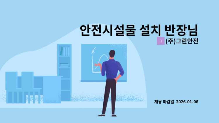 (주)그린안전은 안전시설물 설치, 해체를 전문으로 하는 전문건설회사로 대구 본사에서 근무하실 사무직 직원을 모십니다. <주요 업무> - 공사관리 - 기성청구 - 영업관리지원(cad.포토샾)가능자우대 - 자재 (간판시안.인쇄) 외주 처리