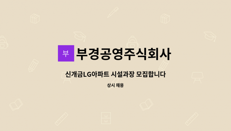 -단지규모 911세대 -근무형태 9:00~18:00 (주5일) -전기, 승강기안전관리자, 소방(보조)선임 가능자 -수변전 4,250KBA/발전시설 1,250KW 선임가능자 -명절, 휴가비 기본급의 15% -1년미만 연차 11개 사용