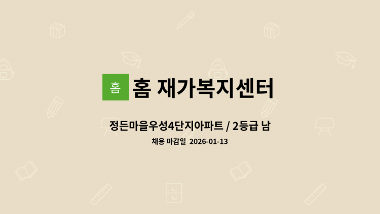 * 정자동 한솔마을 주공6단지) 3등급 할아버지 케어할 재가요양보호사 구인 - 식사,주변정리(독거) - 시급 : 12,800원 (수당포함), - 근무시간 : 주6일근무 16:30~19:30 * 실제 서비스 제공기간에 따라 임금을 계산하여 지급하는 형태로 채용 시 근로자마다 주 소정근로시간이나 임금, 근무(예정)지 등에 차이가 있을 수 있음