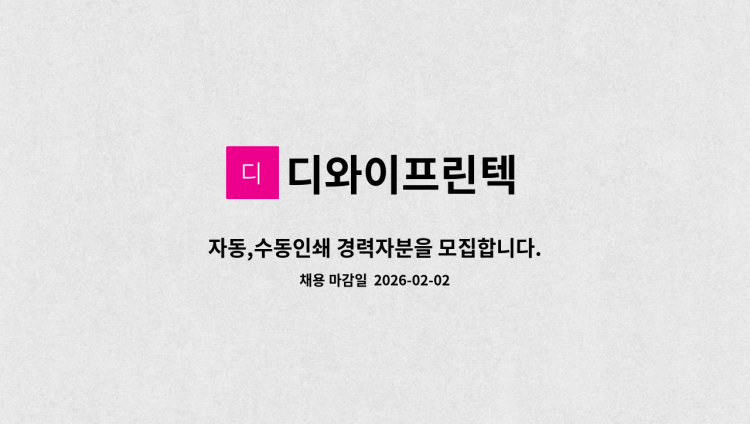 저희 회사는 화장품 용기 실크스크린 인쇄 관련 업무를 하는 회사입니다. 사업확장으로 인해 사원 모집을 하고 있사오니 많은 지원 바랍니다. 위치 : 화성비봉 분야 : 생산직(좌식 작업) 포장 인원 : 00명, 급여 : 협의 혜택 : 4대보험, 퇴직연금, 연차
