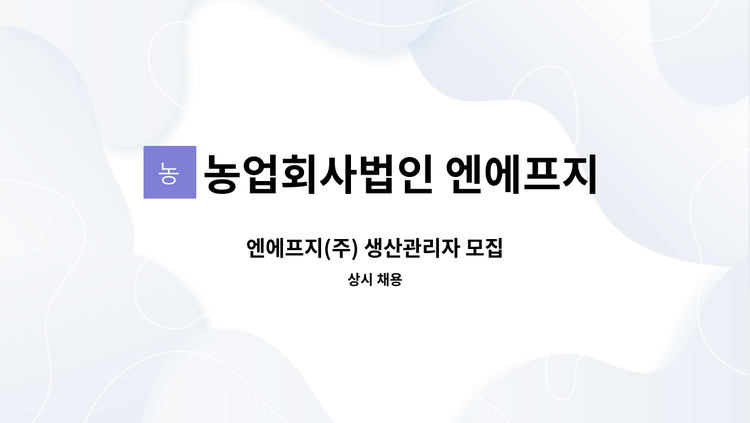 <담당 업무> 1. 토마토 선별 및 포장 작업 사원 모집 인원: 4명 시급: 10,030원~ 자격: 주6일 근로 가능자 (토요일 휴무) 우대: 농산물 가공 업체(해썹 인증 시설) 근무 경력자 우대 근무 시간 08:00~15:00(계절에 따라 근로 시간 연장될 수 있음, 휴일근로 및 초과근로 수당 지급) 2. 생산직 사원 모집 인원: 1명 시급: 13,000원~14,000원 자격: 지게차 면허 소지자, 엑셀 사용 가능자, 주6일 근로 가능자 (토요일 휴무) 우대: 농산물 가공 업체(해썹 인증 시설) 근무 경력자 우대 근무 시간 08:00~17:00(계절에 따라 근로 시간 연장될 수 있음) * 3개월 수습 근무 후 평가에 따라 정직원 채용 및 연봉 협상 * 논산 노성 농공단지 내 사업체 근무