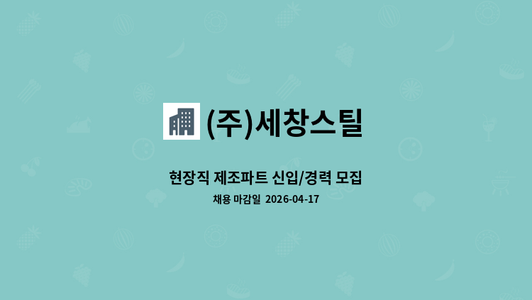 모집부문 직무: 해외영업 근무지: 경기도 안산, 해외 지사 (해외 근무 가능성 있음) 고용형태: 기간의 정함이 없는 정규직 모집인원 근무지 · 경기도 안산시 단원구 별망로 19 (주)세창스틸 안산사무소 담당업무 · 해외 시장 조사 및 분석을 통한 신규 시장 개척 · 기존 해외 고객과의 관계 유지 및 관리 · 해외 바이어 및 파트너사와의 협상 및 계약 체결 · 해외 영업 관련 서류 작성 및 제출 · 해외 전시회, 상담회 등 참여 및 마케팅 활동 지원 · 제품 수출 업무 진행 (통관, 물류 등) · 해외 영업 전략 수립 및 실행 자격요건 · 해외영업 분야 경력 3년 이상 · 영어 능통자 (회화 및 이메일, 전화 대응 가능) · 해외 여행에 결격 사유가 없는 자 · 글로벌 마인드와 뛰어난 커뮤니케이션 능력 · 적극적이고 자율적인 업무 수행 능력 · MS Office(Excel, PowerPoint) 활용 능력 우대사항 · 다른 외국어 능통자 (중국어, 일본어 등) · 스틸 또는 관련 산업 경력자 · 해외 거주 경험 및 국제 업무 경험자 전형절차 · 서류전형 · 1차 면접(실무자 면접) · 2차 면접(임원 면접) · 최종 합격자 발표 근무조건 및 급여 · 1일 8시간 근무 기준 연봉 3천5백만원 ~ 5천5백만원 [경력에 따라 협의 가능] 지원방법 · 이메일 접수: (이력서 및 자기소개서 첨부) · 접수기한: 2025년 01월 19일 (기한 엄수) 기타사항 · 제출된 서류는 반환되지 않으며, 개인정보 보호법에 따라 관리됩니다. · 지원서 작성 시, 지원 동기 및 본인이 해당 직무에 적합한 이유를 기재해 주시기 바랍니다. 세창스틸은 다양한 경험과 글로벌 역량을 갖춘 인재들과 함께 성장하고자 합니다. 많은 과심과 지원 바랍니다.