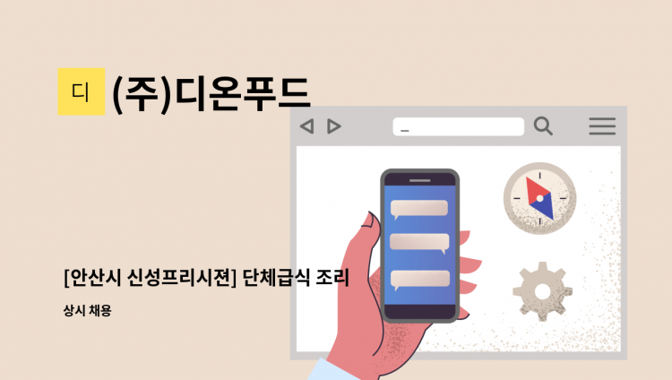 (주)디온푸드 위탁급식 회사입니다. 조리사로 함께 근무하실 분을 찾고 있습니다. 영양사, 조리보조원이 함께 근무하고 있습니다. 1. 모집분야: 조리사 2. 전형절차: 서류전형 - 실무자 면접 - 최종합격 3. 근무형태: 정규직 4. 근무시간: 오전 9:30~15:00 5. 급여: 월 180만원 6. 문의사항: 010-****-**** (*개인정보가 자동 블라인드 됩니다.)(전화주실 때 '안산 조리사'로 말씀해주세요)