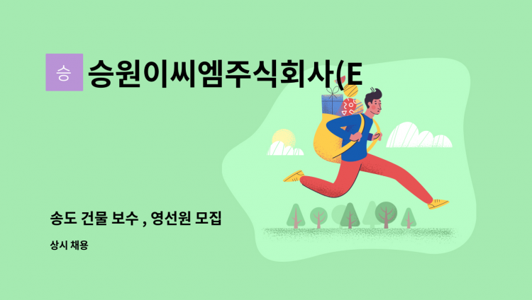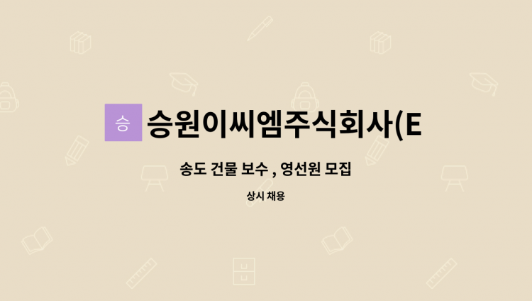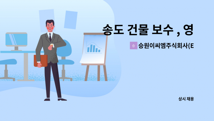 <승원이씨엠> * 업무 : 건물내부 미화 업무 * 근무시간 : 주6일, 월-토 16:00~21:00(휴게시간포함) * 급여 : 월급1,978,410원 * 근무지 : 인천 미추홀구 숙골로87번길5(도화동) * 채용담당자 문의 : 010-****-**** (*개인정보가 자동 블라인드 됩니다.)