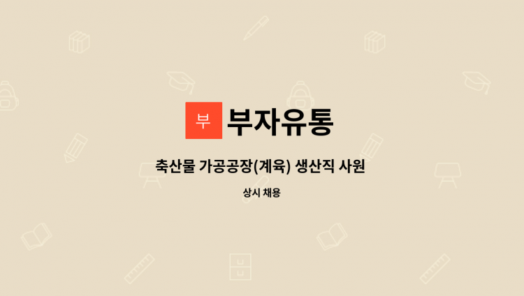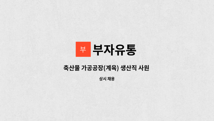 직무내용 - 식품분야 단순노무자, 고기 단순 절단원, 양념원, 택배포장원 경력조건 - 무관 (경력자 우대) 고용형태 - 정직원 근무예정지 - 인천 서구 원창동 382-68 임금 - 월급 2,500,000원 상세근무시간 - 월~금요일 : 07:00 ~ 16:00 - 토요일 : 07:00 ~ 10:00 휴게시간 - 11:00 ~ 12:00 축산물 가공공장(계육) 생산직 사원 모집. 초보자 가능하며 끈기 있고 오래 다니실분 모집합니다. 작업도중 무거운 물건이 있어 기본적 체력 필요합니다. 계육 가공식품, 택배 포장, 청소 등 전반적인 생산업무 입니다.