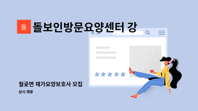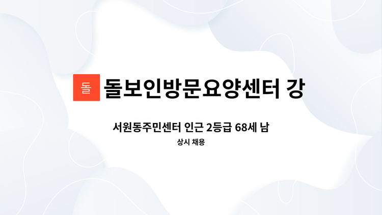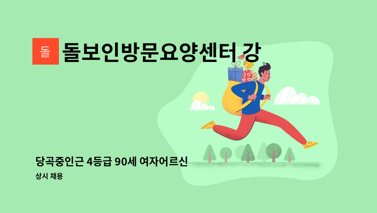 - 5등급 여자어르신 - 거동불편 - 인지프로그램 및 인지활동지원 - 13:00~16:00 / 주5일근무 - 시급 12,700원 (시급10,030원+기타수당) - 치매이수자