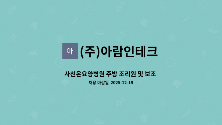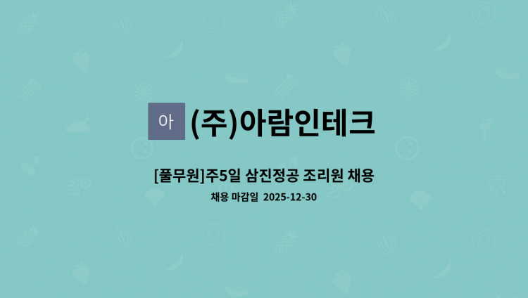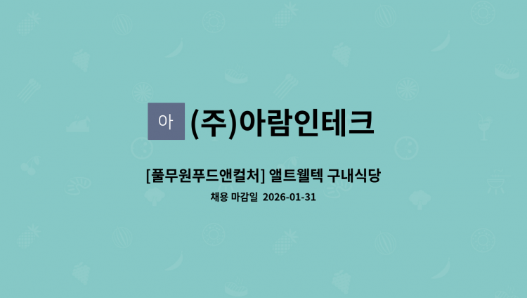 풀타임 근무시간 : 08:30~18:30 휴게 60분 근무요일 : 주5일 (월~금) 근무 : 세척, 설겆이, 청소 급여 : 250만원 파트타임 근무시간 : 08:30~14:00 휴게 30분 근무요일 : 주5일 (월~금) 근무 : 세척, 설겆이, 청소 급여 : 150만원 많은 지원 바랍니다.