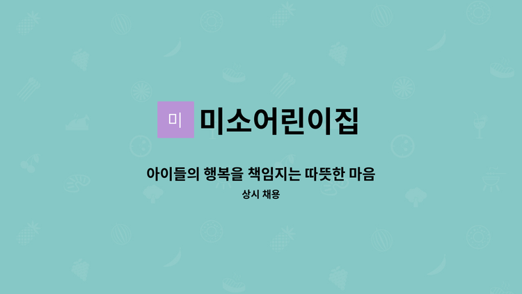 서산시 예천동에 위치한 미소어린이집입니다. 모집교사 2명입니다. 1)연장보육과 힘쎈충남형 겸직교사 1명 2)주말형 보육교사 1) 연장보육및 힘쎈충남형 교사 *자격증: 보육교사 2급이상 *근무시간: 오후 3시~오후 10시까지 2)주말형교사 *자격증: 보육교사 2급이상 *근무시간:오전9시~오후6시 *급여: 대략 1.000.000원+@ ****공통사항**** -휴게시간 및 연차사용 -접수: 이력서와 자기소개서를 이메일로 보내주세요. [email protected] -문의사항은 이메일 및 원으로 연락주세요. 669-9199