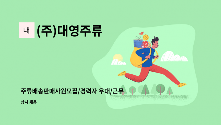 (주)대영주류는 1987년 '正道經營'을 목표로 설립하여 정직, 고객을 위한 가치창조, 사회공헌의 기업가치를 실현하기 위해 노력해 온 종합주류유통 기업입니다. 지난 37년간 (주)대영주류는 고객의 성원에 힘입어 지속적인 성장을 거듭해왔으며, 업계 최고의 일류기업으로 거듭나기 위해 최선의 노력을 기울이고 있습니다. (주)대영주류와 함께 성장할 적극적인 신입사원을 모집합니다. 새로운 도전을 함께 할 열정적인 분들의 지원을 기다립니다.