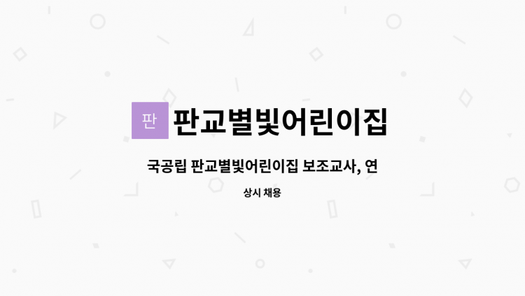 국공립 판교별빛어린이집은 사회복지법인 사랑교육복지재단에서 위탁운영하는 어린이집입니다. 따뜻한 마음으로 영유아를 존중하고, 책임감이 강한 역량 있는 교직원을 모집하오니 소명의식을 가진 분들의 많은 지원을 바랍니다. 1. 소재지 : 경기도 성남시 분당구 판교대장로5길 68 2. 채용분야 및 자격사항 보육교사: 보육교사1급, 2급, 정교사1급,2급 ※ [영유아보육법] 제16조 및 동법 제20조의 결격사유에 해당되지 않는 자 3. 1차 제출서류 1) 이력서 (반명함판 사진부착) 및 자기소개서 - 첨부문서확인 2) 최종학교 졸업증명서 3) 자격증사본 4) 경력증명서 (채용공고일 이후 발급 / 근무한 경력 전체발급) 5) 장기미종사자 직무교육 수료증 (해당자에 한함) -2년이상 보육 공백 있을 경우 ‘어린이집 장기 미종사자 직무교육과정’을 필수로 이수해야 함 ※ 임용 후 서류 등이 허위로 판명될 경우 임용을 취소할 수 있음 ※채용시 제출서류: 1) 개인정보 제공 및 고유식별정보처리 동의서 - 첨부문서확인 2) 성범죄경력 조회 동의서 및 아동학대 관련 범죄전력조회 동의서 - 첨부문서확인 4. 접수방법 · E-mail 접수 (메일주소: [email protected]) · 제출서류는 첨부 파일 양식을 사용 · 이메일 접수 시 반드시 첨부 파일 양식을 사용하며, 1차 제출서류를 알집으로 압축 후 메일 제목과 파일명은 [지원분야, 지원자이름(ex.담임교사지원,000)]으로 제출 요망 5. 급여 및 근무시간 · 급여조건: 2025년 보육교직원 인건비 지급기준 · 근무시간: 근로기준법에 준함 6. 지원서 접수 시 유의사항 · 구비서류 미제출, 연락 두절 등으로 인한 불이익은 지원자 본인의 책임으로 합니다. · 접수 기간 외 입사지원서는 서류전형에 포함되지 않습니다. · 접수된 서류는 일체 반환하지 않으며, 채용목적 이외에는 사용하지 않습니다. 7. 문의처 국공립 판교별빛어린이집 031-****-**** (*개인정보가 자동 블라인드 됩니다.)