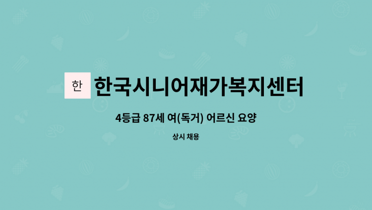 - 2등급 남자어르신 일상생활지원(기저귀케어, 체위변경, 콧줄식사, 병원동행 등) - 시급10,030원+ 각수당포함 =12,700원(중증가산수당 1일 3,000원 별도지급) - 월,수,금: 09:00~13:00, 화,목: 09:00~15:00