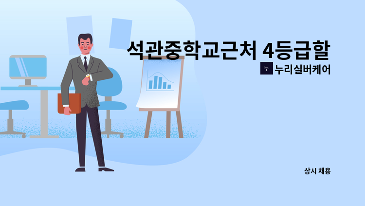 * 재가요양보호사 선생님모집 * - 4등급 할머니 어르신,거동가능하심 - 가족과 거주하시지만 서비스 시간에는 안계심 - 식사준비, 청소, 부축도움, 기저귀케어(가끔) - 주6일, 09:00~15:00(6시간/ 3시간은 보호자 부담) - 시급 12,700원(기본급+주휴수당+연차수당 등 수당포함)