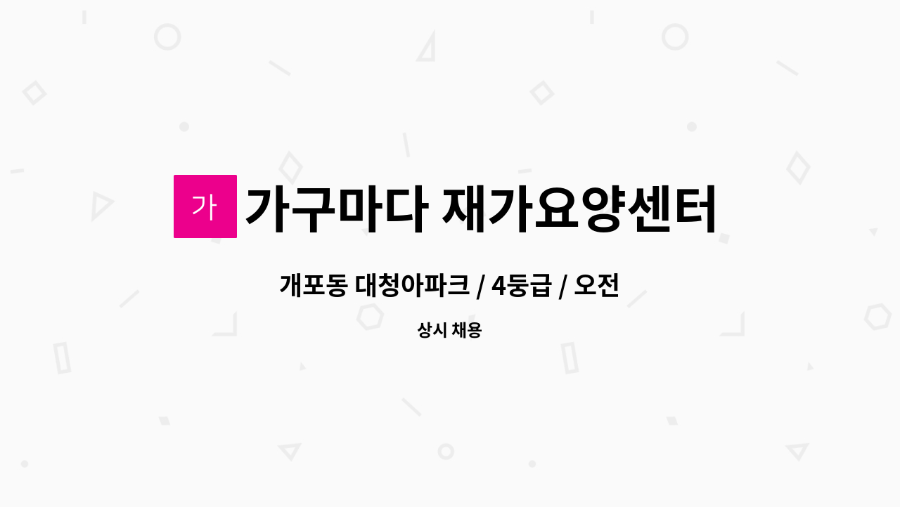 - 개포동 대청아파트 - . 4등급 할머님 케어(식사,청소,세탁,목욕,산책,말벗 등) - 주5일 9-12시 - 기본시급 10,030원 (주휴 및 연차수당 등 포함 13,000원) - 지원 010 5720 3683