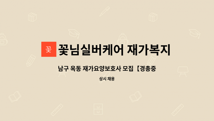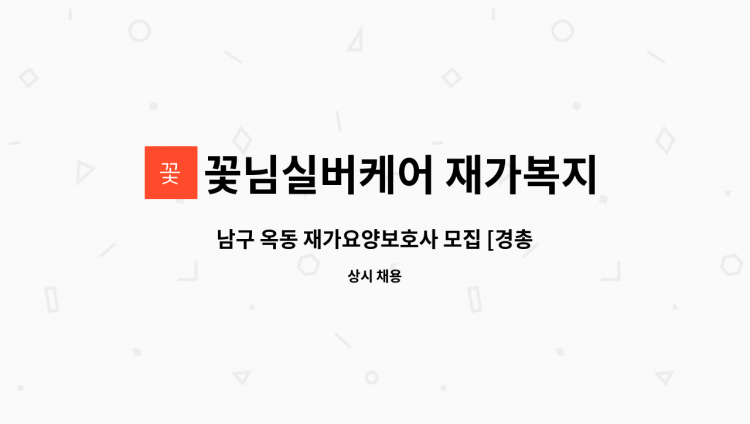 ◈ 다운동-4등급 어르신케어 재가요양보호사 모집 ◈ ▶직무내용 : 4등급 할머니케어 업무(일상생활 돌봄, 식사도움, 가사 지원, 병원동행-배우자님 차로 이동) ▶근무시간 : 9:00~12:00(3시간)/주6일근무(월~토) 월24회 ▶급여조건 : 시급 12,700원(수당포함) ▶근무장소 : 다운동 CU편의점 인근 ▶기타사항 : 요양보호사 필수 ※ 지원문의: 경총 중장년내일센터 직업상담사 한희숙 ☎ 052-****-**** (*개인정보가 자동 블라인드 됩니다.)