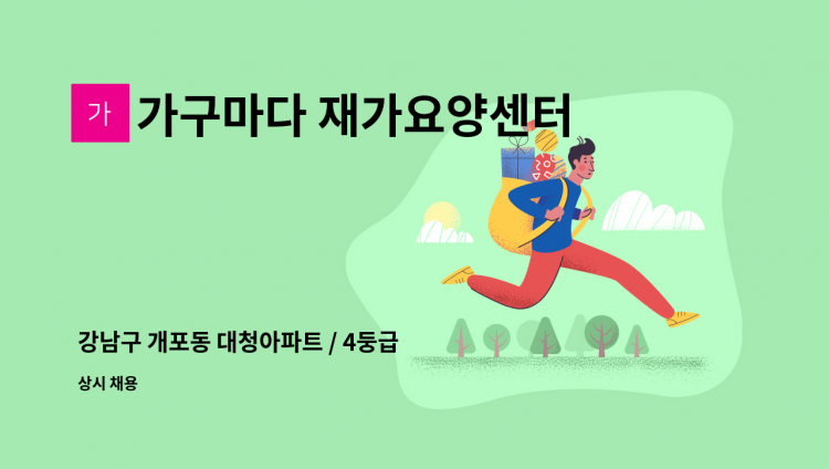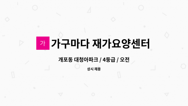 - 개포동 대청아파트 - . 4등급 할머님 케어(식사,청소,세탁,목욕,산책,말벗 등) - 주5일 9-12시 - 기본시급 10,030원 (주휴 및 연차수당 등 포함 13,300원) - 지원 010 5720 3683