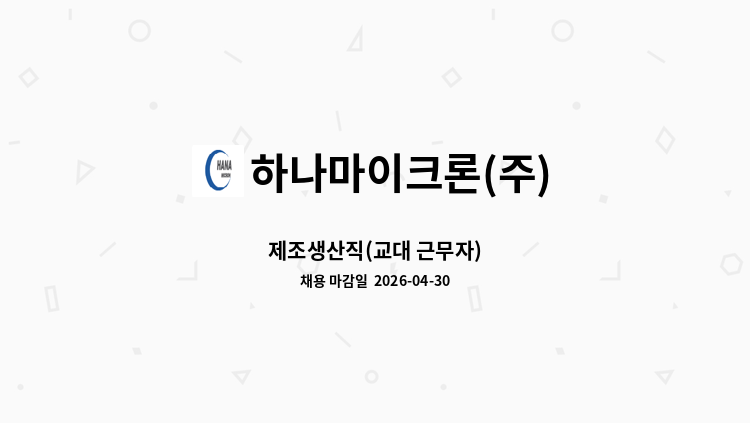 Excellence in Manufacturing Service 하나마이크론은 반도체 패키징 및 테스트 전문기업입니다. 하나마이크론은 최고의 제조경쟁력과 노하우를 바탕으로 급변하는 시장 상황에서도 고객이 원하는 시기에 원하는 기술과 제품을 제공하고 있습니다. 삼성전자, SK하이닉스, 국내외 최고의 팹리스 업체 등 유수의 고객들과의 파트너쉽을 통해 지속적인 성장을 거듭하고 있으며, 삼성, 하이닉스 등 대형 고객사로부터 여러차례 우수 공급업체로 선정되는 등 그 기술력과 품질경쟁력을 인정받고 있습니다.