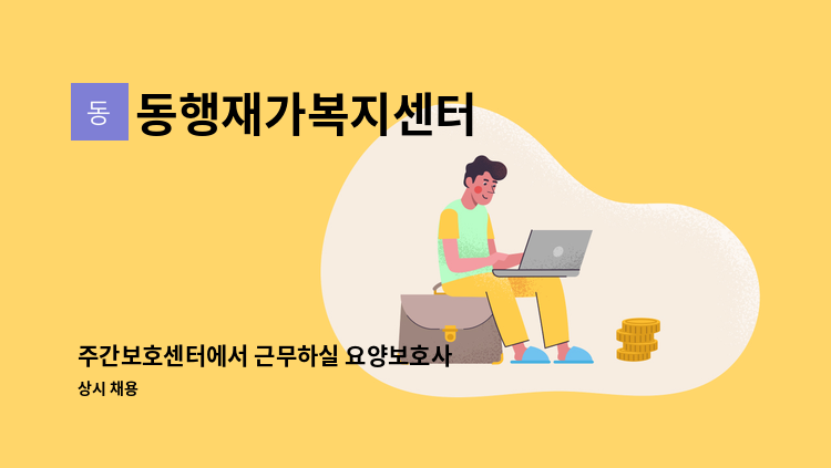 동행재가복지센터 에서 함께 일하실 방문요양 가산 사회복지사 선생님을 모집합니다. * 근무내용 - 방문요양 가산 사회복지사 업무 * 근무시간 - 주 5일제 근무 ( 8:30 출근 - 17:30 퇴근) * 자격 사항 - 관련 업무 경력자 우대 (★필수★ 치매교육이수자) *라운딩 업무로 차량 소지자 가능 (유류대 지원) ★실업급여 구직활동에 의한 입사지원은 지양합니다.(★모든지원자유선확인) *지원을 희망하는 경우 고용24 입사지원해주세요. (서류합격자에 한하여 개별연락 예정)