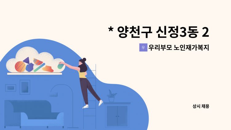 * 영등포동 한집에 부부 할아버지(87세 4등급 1시간)+할머니(86세 3등급 2시간) 요양보호사 구인 * ● 위치 : 영등포동 5호선 영등포시장역 도보 5분 (신월4동 강서초 앞에서 버스+전철+도보로 총 약25분 ) ● 대상자 : 할아버지(87세 4등급 1시간)+할머니(86세 3등급 2시간) 두분 거주 (애완견 없음. 11월3일까지는 딸 한 분 있음) ● 건강상태 : 할아버지(거동과 대화 양호), 할머니(거동은 불편, 대화는 양호) ● 업무내용 : 청소, 식사준비, 말벗 등 ● 근무시간 : 주5일 월~금 오전11~오후2시 할아버지(1시간)+할머니(2시간) = 하루 3시간씩 ● 시급 12,650원 ● 문의 : ☎ 02-****-**** (*개인정보가 자동 블라인드 됩니다.) / 010-****-**** (*개인정보가 자동 블라인드 됩니다.) 우리부모방문요양센터