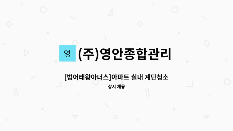 *경산시 힐스테이트펜타힐즈 아파트 계단청소원 모집 - 초보가능 - 계단 신주없음 -경산,시지, 수성구지역 거주자 환영 - 근무시간 : 주6일 / 평일 09:00~16:00 (점심시간1시간), 토요일 격주 근무 09:00~12:00 - 월급 1,656,160원 * 이력서 팩스 송신시 이력서 상단에 아파트명과 지원분야를 꼭 기재하시기 바랍니다. (예:경산시 펜타힐즈 힐스테이트 청소원 지원) * 지원문의: 북구청 053-****-**** (*개인정보가 자동 블라인드 됩니다.)