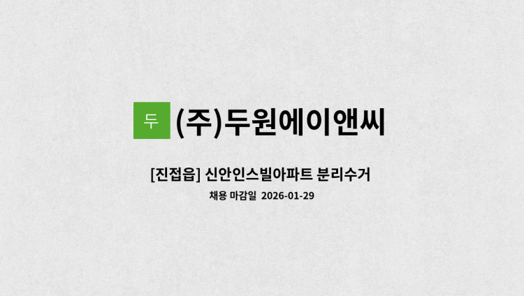 * 아파트 미화원 1명 구인 - 근무시간 : 평일 09:00~16:00(휴게1시간), 토 09:00~12:00(격주근무) - 급여 : 1,681,650원 * 관리이사에게 이력서 송부, 면접일정 통보하고 면접시 이력서 지참하여 참석