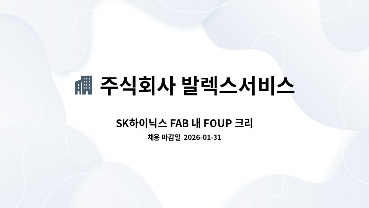 ■ 직무내용 : 경기도 이천시 SK하이닉스 內 기업 정보 및 자산보호, 보안검색(출입관리), 보안서비스(고객/VIP응대) ■ 학 력: 고졸이상 ■ 급 여: 초임기준 연 3,350만원 (근속년수 별 근속수당 별도) ■ 우대사항 : 장교/부사관 출신, 신임교육 이수자, 보안업무 경력자, 즉시 출근가능자 ■복리후생 ◎ 포상제도 : 우수사원 포상 및 해외연수 참여(상/하반기), 실적 성과포상 등 ◎ 사외숙소 : 원거리 거주자 및 교대근무자를 위해 사업장 인근 숙소 운영 ◎ 통근버스 : 이천 관내, 여주, 용인, 수원, 서울 및 수도원 일대 통근버스 운행 ◎ 식사제공 : SK하이닉스 사업장 內 구내식당 이용 ◎ 체육시설 : SK하이닉스 사업장 內 체육시설(헬스장, 폿살장, 수영장 등)이용 ◎ 편의시설 : 은행(신한,국민,하나,우리,농협,새마을), 편의정(GS), 커피숍(Cafe) 등 ◎ 휴일/휴가 ; 연차휴가, 장기근속휴가, 연중휴가, 정무지정 공휴일 등 ◎ 건강검진 및 의료시설 : 일반검진, 특수검진, 무료예방접종, 사내부속의원/약국 이용