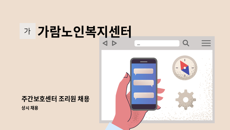- 주간보호센터, 사회복지행정 및 프로그램 업무(경력 1년 이상자 우대), 송영업무(운전면허 2종, 운전 필수) * 평일 09:00~18:00, 토요일 격주 근무 - 휴일 근무수당 급여에 포함 * 급여:2,158,880원(토요일 미근무시)- 2,358,120원(토요일 격주 근무시) * 중식제공(식비 70,000원 급여 공제)