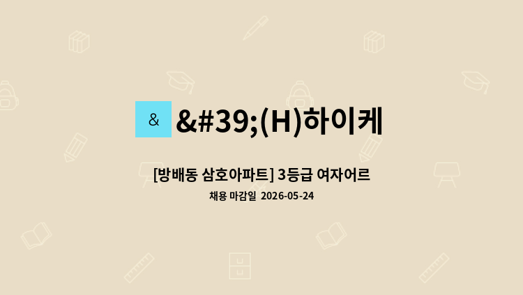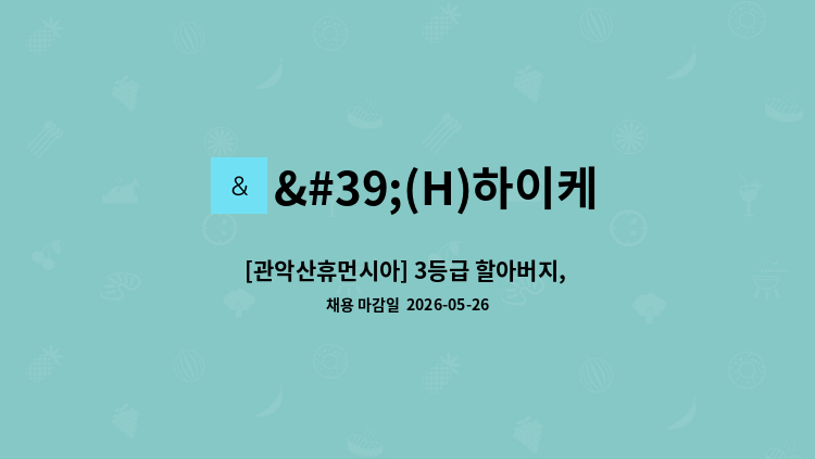 [남부초등학교 인근]4등급 할머니 오전(12:30~15:30 시간조정가능 ), 주 5일 - 식사준비, 청소, 주변정돈, 말벗 등 - 오전(12:30~15:30 시간조정가능 ), 주 5일 - 시급: 13,300원(주휴+월차수당 포함) * 참고사항 반려견 있음