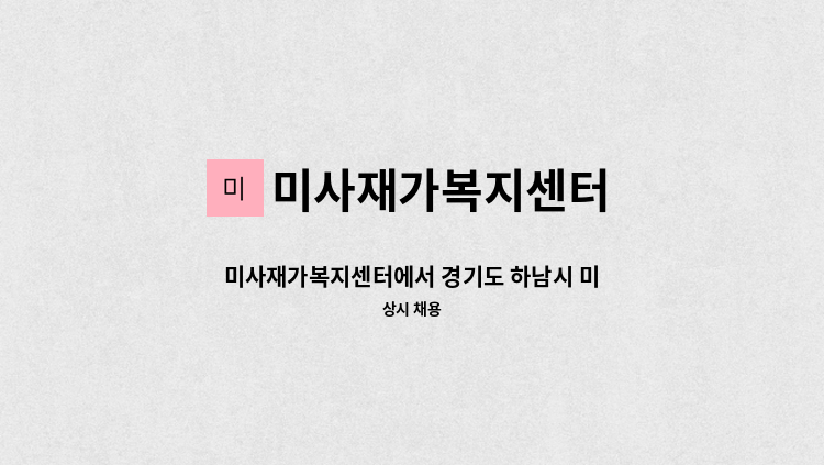 '사람 사이 사랑담은 서비스로' 안녕하세요. 미사재가복지센터입니다^^ 미사재가복지센터에서 경기도 하남시 미사14단지에서 근무하실 입주요양선생님을 구인합니다. <근무장소> 경기도 하남시 미사14단지 1405동 <시급> 10,320원+각종수당= 13,200원 (공단 제공 시급 13,200원으로 생각하시면 됩니다) <근무시간> 월~토 : 9시~13시 <근무범위> 걷기도움, 기저귀케어, 식사도움, 말벗, 복약도움, 주변정리정돈 <세부내용> 컨디션이 괜찮으셨다가 병원에 입원해 계시는 바람에 근력이 약해 지시어 2등급을 받게 되신 여자어르신입니다. 다행이도 컨디션이 많이 오르셔서 워커에 의지해 조금씩 걷기 운동이 가능하시니 선생님께서 한번씩 워커 운동하시게끔 기분좋은 잔소리 해 주시면 좋겠습니다. 근력이 완전히 있으신게 아니라 아직은 기저귀 케어 하고 계시고 식사와 복약 도움 주시고 나머지 시간은 주변 정리 정돈 도와주시면됩니다. 어르신께서 참 편안하시고 마음 착하세요. 보호자님과 상담도 참 좋았습니다. 착한 분들이시니 마음 좋으신 선생님께서 길게 함께 가 주시기를 바랍니다 ^^ <덧> 방이 하나 있는데 아스퍼거가 있는 자제분이 방 밖을 나오지 않고 안에서 지내고 있어요. 따로 활동보조인분이 와서 케어해 드리니 어르신 외에 다른 일은 전혀 없고, 특이한 행동하시는 것 도 전혀 없지만 사전에 말씀드리기 위해 특이사항을 말씀드립니다. 양지하시고 지원 부탁드립니다. ------------------------------------------------------------------------------ 저희 미사재가복지센터는 최적의 연계를 목적에 두고 있습니다. 상생하는 관계로서 대상자분, 보호자분들도 오랜 기간동안 한분께 서비스 받으시기를 원하시고 요양보호사선생님도 꾸준히 한군데에서 일 하시길 원하시에 면접에 특별히 신경을 쓰고 있습니다. 또한 열심히 하고자하는 마음이 느껴지셔서인지 함께 하시는 분들께서 다른 곳으로 가시지 않으시고 저와 함께 꾸준히 걸어가주고 계십니다. 이 부분에 상당히 자부심을 느끼며 그만큼 직원 복지에 가장 힘쓰고 있습니다. 진심으로 감사드리고 있습니다^^ 더 궁금하신 사항은 홈페이지를 참조해 주시고 연락 주시고 방문 부탁드립니다. 미사재가복지센터 0l0-6836-9988 홈페이지 https://blog.naver.com/misa2080