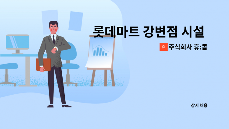 [잠실]롯데월드타워 공용부 시설관리 기계(설비) 파트장 채용 - 근무형태 : 주5일 일근직 - 자격조건 : 에너지관리기사 또는 에너지관리산업기사 (보일러 30ton 이상 선임가능자) (필수) - 업무내용 : 기계파트 관리직 및 기계팀 시설물 유지 관리 보수 업무 - 급여형태 : 월 345만원 이상 (면접 후 결정) - 복리후생 : 4대보험/ 연차/ 퇴직연금/ 1식 제공/ 피복제공/ 각종경조사 제공