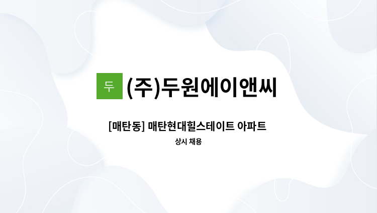 *한양수자인파크원 아파트 외곽 미화 업무 *아파트 단지 외부 청소 및 분리수거 등 *주 6일 근무 (월,화,목 09:00~16:00/(금)08:00 ~ 15:00(토)13:00 ~ 16:00(격주 휴무) *담당자 통화 후 방문: 010-****-**** (*개인정보가 자동 블라인드 됩니다.)