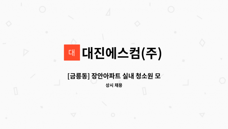 진관동 은평뉴타운 상림마을 제3단지아파트 청소업무 / 주6일근무 월~금 09:00~16:00 (휴게시간 1시간30분) 격토 09:00~12:00 / 월 1,307,230원 / 채용담당자와 통화후 면접진행