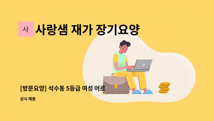 ■ 동안구 한마음 비급여 할아버지 ■ 식도암, 수술후 누워계심, 기저귀착용, 식사, 청소, 세탁원하심.(부부거주) ■ 현재는 주3일 ( 월,수,금 13:00 ~16:00 ) , 등급나오면 주5일 적용. ■ 구인내용 확인후 010-3133 -3641 (건강검진결과표 최근1년이내) 지참해주세요