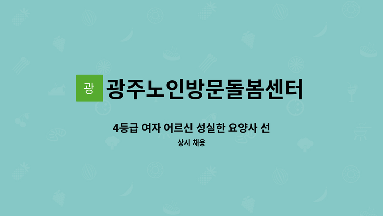 * 4등급 여자 어르신 케어 - 경기도 광주 오포 고산리 우림 아파트 거주 - 근무시간:0900:1200 - 시급: 11000원 - - 일상생활지원 및 식사지원 시간조율가능 [실제 서비스 제공기간에 따라 임금을 계산하여 지급하는 형태로, 채용 시 근로자마다 주 소정근로시간이나 임금, 근무(예정)지 등에 차이가 있을 수 있음]
