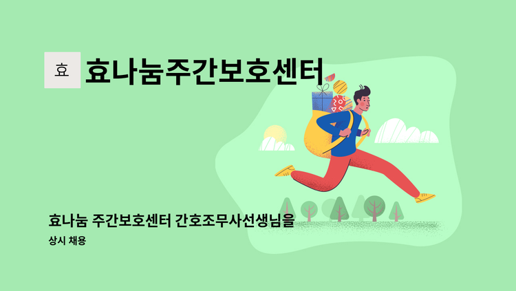 입소 어르신 케어(기저귀 케어, 식사도움), 프로그램 참여 등 - 주5일, 08-17시 근무 - 주 2일 휴무 - 월급여: 1,850,000원 - 운전가능자 우대