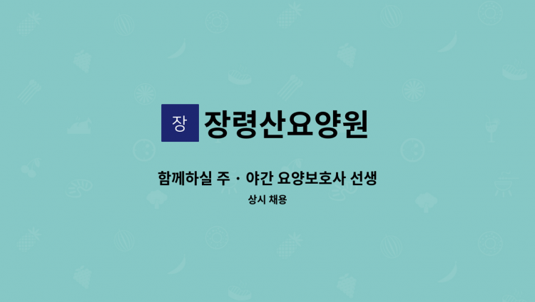 주간 요양보호사 2명 / 야간요양보호사 1명 모집합니다. (주간요양보호사) 일 8시간 근무 (09:00~18:00) 평일, 주말 관계없이 주 5일 근무 (야간요양보호사) 한달 15~16일 근무 18:00 ~ 09: 00 까지 근무 (00:00~04:00 휴게시간지급) 어르신들께 친절하게 대해주실분! 근무표에 맞게 성실하게 출 · 퇴근 해주실분! 긍정적으로 일해주실분! 환영합니다!