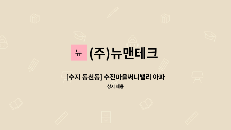 *동탄2 아파트 공용부분(골프장,휘트니스,카페) 미화원채용 -근무지:화성시 통탄대로3길33(장지동) -급여 1,477,730 -근무시간 평일09:00~16:00/토09:00~12:00