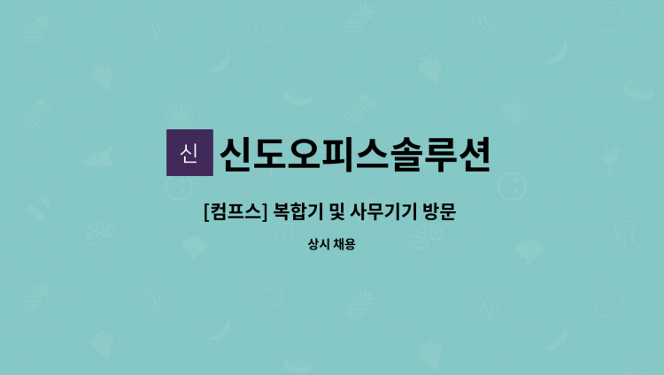 저희는 세종시에있는 사무기기 전문업체 신도오피스솔루션입니다. 신도리코 서비스 지정점으로 복사기, 프린터, 컴퓨터 등을 임대, 판매, AS 하고있으며 관련 장비를 방문 서비스 할 수 있는 직원을 고용하고자 합니다. 많은 지원 부탁드립니다. 관련 지식은 관심 정도여도 관계없으며 차차 성실하게 배우면서 일할 수 있는 직원이었으면 좋겠습니다. 운전은 필수입니다.