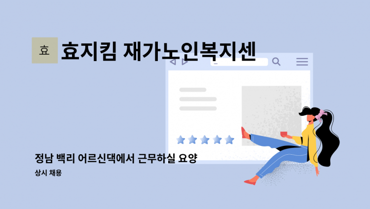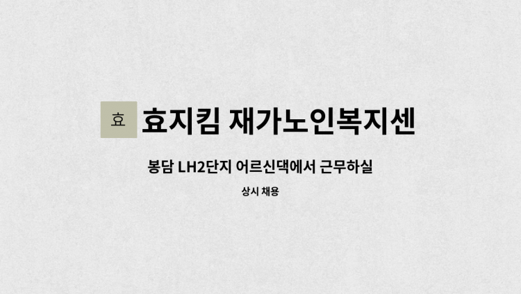 안녕하세요~ 효지킴 노인복지센터에서 요양보호사를 구인합니다. - 1등급 어르신 - 근무지: 금복리 - 근무요일 및 시간: 월~토 9시~13시 또는 8시~12시 (시간조정가능) - 업무: 어르신 식사 도움, 청소, 세탁, 목욕, 말벗 등 어르신 케어 031-****-**** (*개인정보가 자동 블라인드 됩니다.) ※실제 서비스 제공기간에 따라 임금을 계산하여 지급하는 형태로 채용 시 근로자마다 주 소정근로시간이나 임금, 근무(예정)지 등에 차이가 있을 수 있음※ 전화로 지원해주세요. ^^ 031-****-**** (*개인정보가 자동 블라인드 됩니다.)