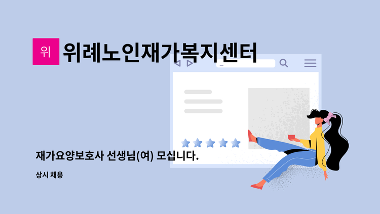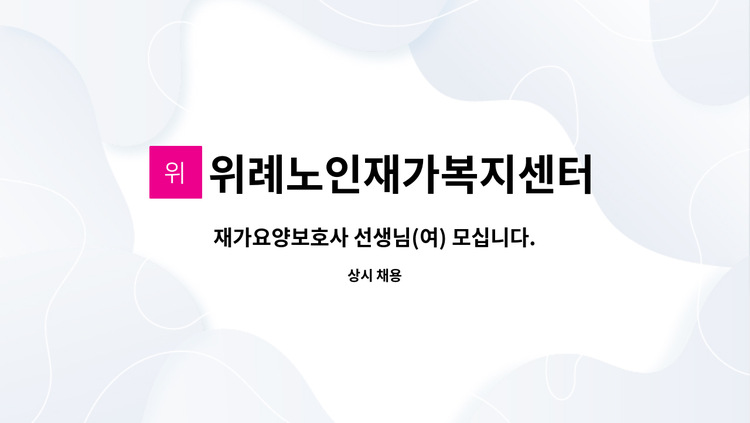 요양보호사 구인 위례 32단지 3205동 3등급 여자 어르신. 시급 11,500원 월~금 / 하루 3시간 (오후 3시~오후6시) 바로 근로 가능
