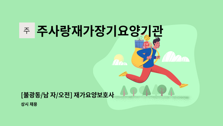 - 직무내용: 3등급 할머니케어(가사,신체도움) - 근무시간 : 14:00~17:00 / 주5일 - 급여: 시급 11,000원 - 근무지: 불광동 대광월드아파트(연신초등학교근처,통일로 88길3) ※ 실제 서비스 제공기간에 따라 임금을 계산하여 지급하는 형태로 채용 시 근로자마다 주 소정근로시간이나 임금, 근무(예정)지 등에 차이가 있을 수 있음
