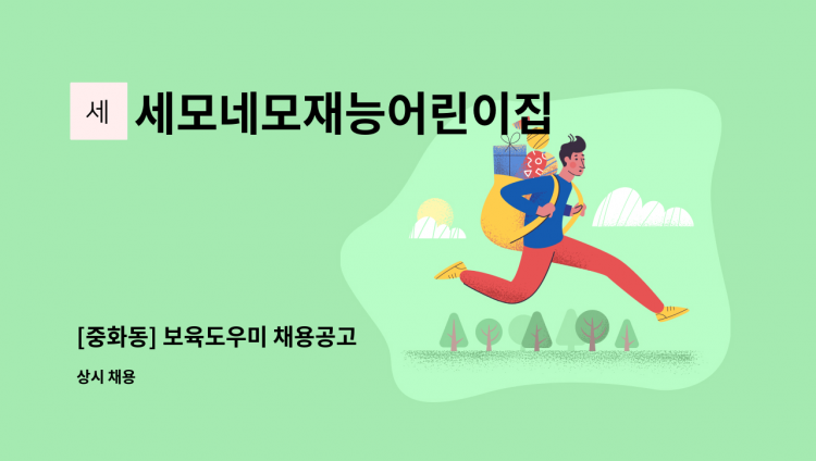 [중화동] 어린이집 보육교사 구인 - 근무시간 09:00~18:00 - 주 5일 - 월급 1,911,000원 - 경력자 우대 - 지원방법 : 이력서 메일 접수 ([email protected]) 후 면접자 개별통보 예정