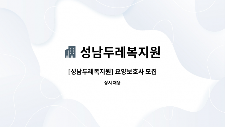 성남두레복지원에서 어르신 건강을 관리해 주실 분을 모십니다. 직종 : 간호사 또는 간호 조무사 ● 워크넷 미가입자는 회원가입 후 로그인 - 구직신청 - 사업장 선택 - 워크넷 입사지원 바랍니다. ● 실업급여 수급자는 지원을 제한합니다. 실제 근무가능자만 지원해 주십시오.