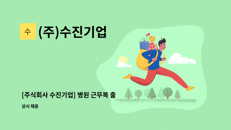 수진기업에서 병원에서 근무하실 직원을 채용합니다. 근무지 : 동국대학교의료원(일산) 수진기업 소속(정직원) 직원으로 근무하게 되시고, 주 업무는 린넨병동 납품 및 수거 입니다. (알선업체 아닙니다) 평일 : 월~금 09:00~18:00 토요일 : 월1회~월2회 07:30~11:30 ※ 근무시간은 변동이 있을 수 있으며, 대략 07:30~18:00 안에서만 변동이 있습니다. 식대는 지급해드리며, 연차 및 4대 보험가입 퇴직금(1년이상근무시) 별도 입니다.