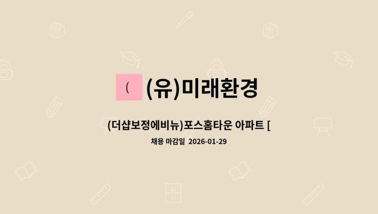 - 용인 이삭 아파트 경비원 모집 - 주간근무 평일 09:00-16:30, 토요일 09:00~12:00 - 이력서 촬영하여 핸드폰(010-****-**** (*개인정보가 자동 블라인드 됩니다.))으로 먼저 전송 후 면접진행함. - 경비원 신임교육이수 필
