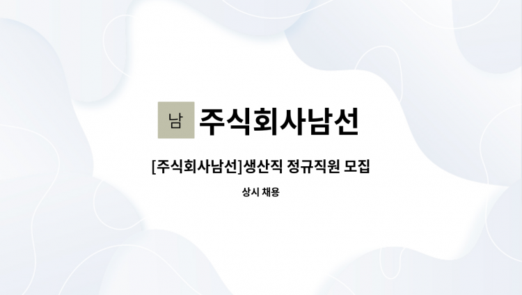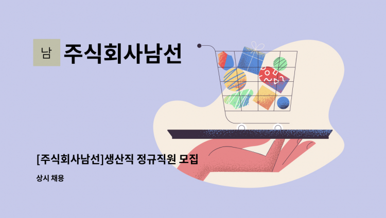* 직무내용 : 주방용품(냄비,후라이팬 등) 생산 및 검사, 포장 * 대구지역 통근버스 운행 (경산고->신기역->방촌시장->동구청->원대오거리->팔달시장->팔달교->칠곡중학교 방면) *근무시간: 오전8시~오후4시30분/오후4시20분~24시//주간반만, 또는 오전, 오후 교대근무 -입사지원방법: 워크넷 입사지원하기 버튼 누르시면 됩니다.