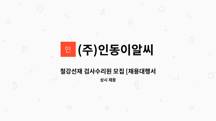 세아특수강내 철강선재제품 출하작업 - 채용대행서비스 신청사업장입니다. 워크넷 구직신청(구직인증번호생성)후 지원하시기 바랍니다. - 제출서류: 이력서 - 접수방법: 워크넷 입사지원. 이메일 [email protected] (제목 (주)인동이알씨(지게차)-성명-연락처기재) 방문(포항고용센터 4층 취업지원창구) - 실업급여 구직활동이 아닌 취업의사가 있는 분만 지원하시기 바랍니다