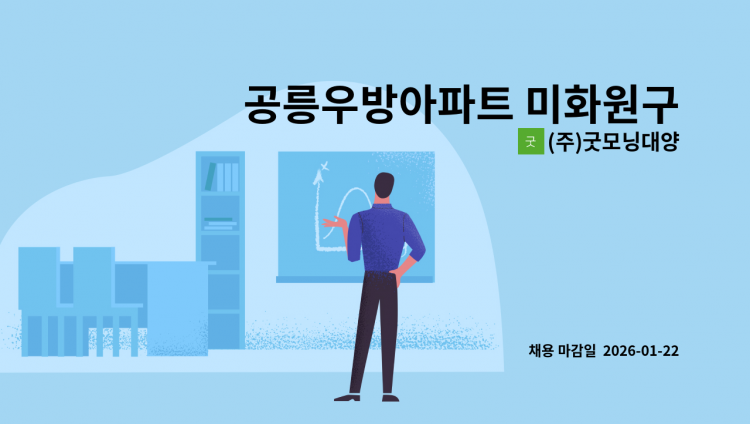 - 아파트 단지 내 청소 - 급여 : 월1,193,770원 - 근무시간 :평일 :08:00~15:30(휴게시간/11:30~13:00)/토요일(격주근무)09:00~12:00/반장님:010-****-**** (*개인정보가 자동 블라인드 됩니다.) 로 전화지원