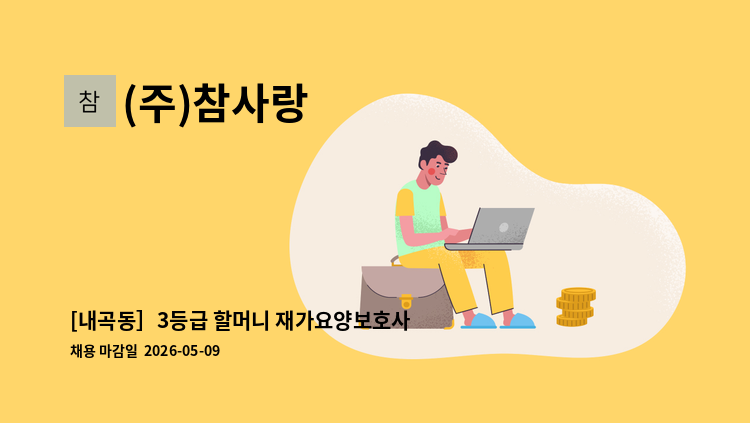 화정동 은빛마을6단지 재가요양업무 / 4등급 할아버지 / 주3일근무 13:00~16:00(월,수,금) / 시급 11,600원 / 채용담당자와 통화후 면접 * 실제 서비스 제공기간에 따라 임금을 계산하여 지급하는 형태로 채용 시 근로자마다 주 소정근로시간이나 임금, 근무(예정)지 등에 차이가 있을 수 있음