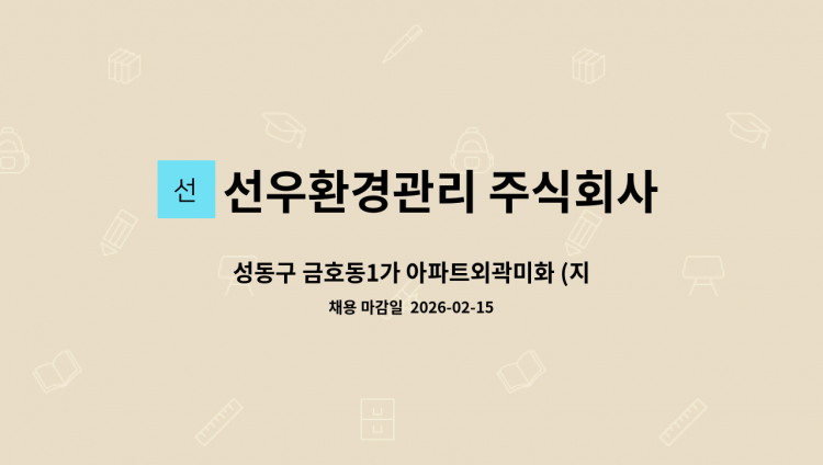 동산동 동산마을 화성파크드림 파티오 아파트 내부 청소업무 / 주5일 근무(09:00~16:00), 휴게시간 12:00~14:00 / 월1,244,100원(중식비 50,000원 포함) / 미화반장님 : 010-****-**** (*개인정보가 자동 블라인드 됩니다.) 통화 후 면접